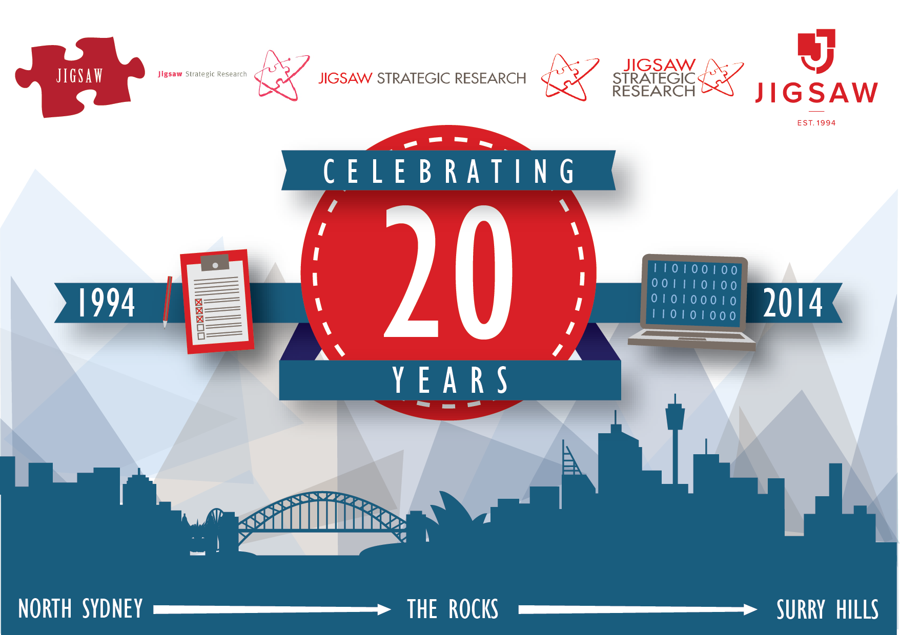Last year also marked the 20th anniversary of the company. I was tasked with designing a postcard that got inserted and distributed in Research News magazine. I illustrated the trends of 1994 and 2014 and again kept the design within our company palette.