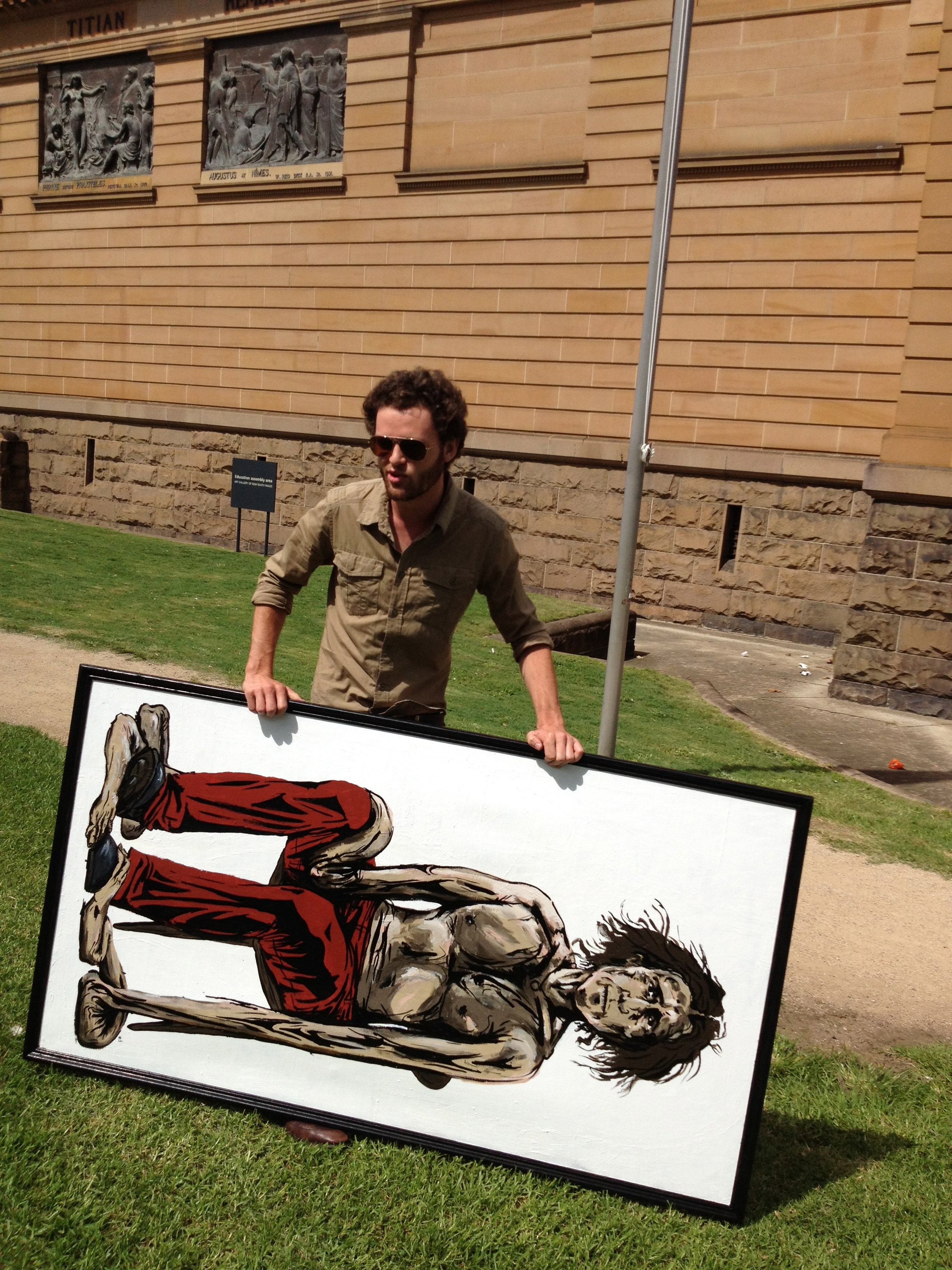 Fellow Sydney Fringe comedian Tom Walker joined me on this trip to the Sydney Uni. I think his parents are really happy Tom had someone to play with this week. Tom painted some things as well including the following image… it’s a character Tom assures me exists called Buff Man.